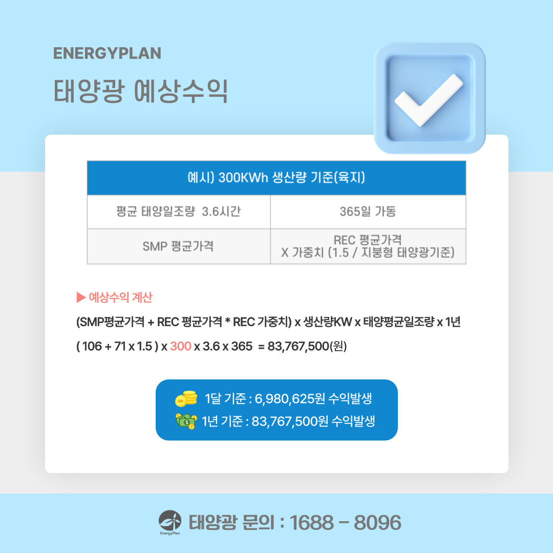 (SMP 평균 가격 + REC 평균 가격 * REC 가중치) x 생산량 KW x 태양 평균 일조량 x 1년