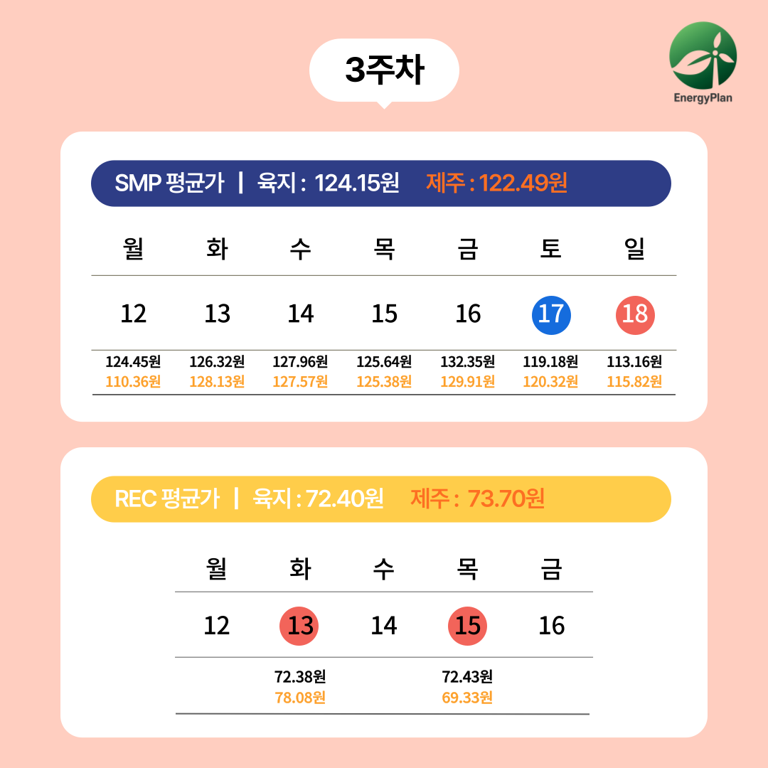 2025년 5월 3주 차 기준으로 SMP(계통한계가격) 및 REC(신재생에너지공급인증서) 평균 단가 정보를 안내드립니다.
