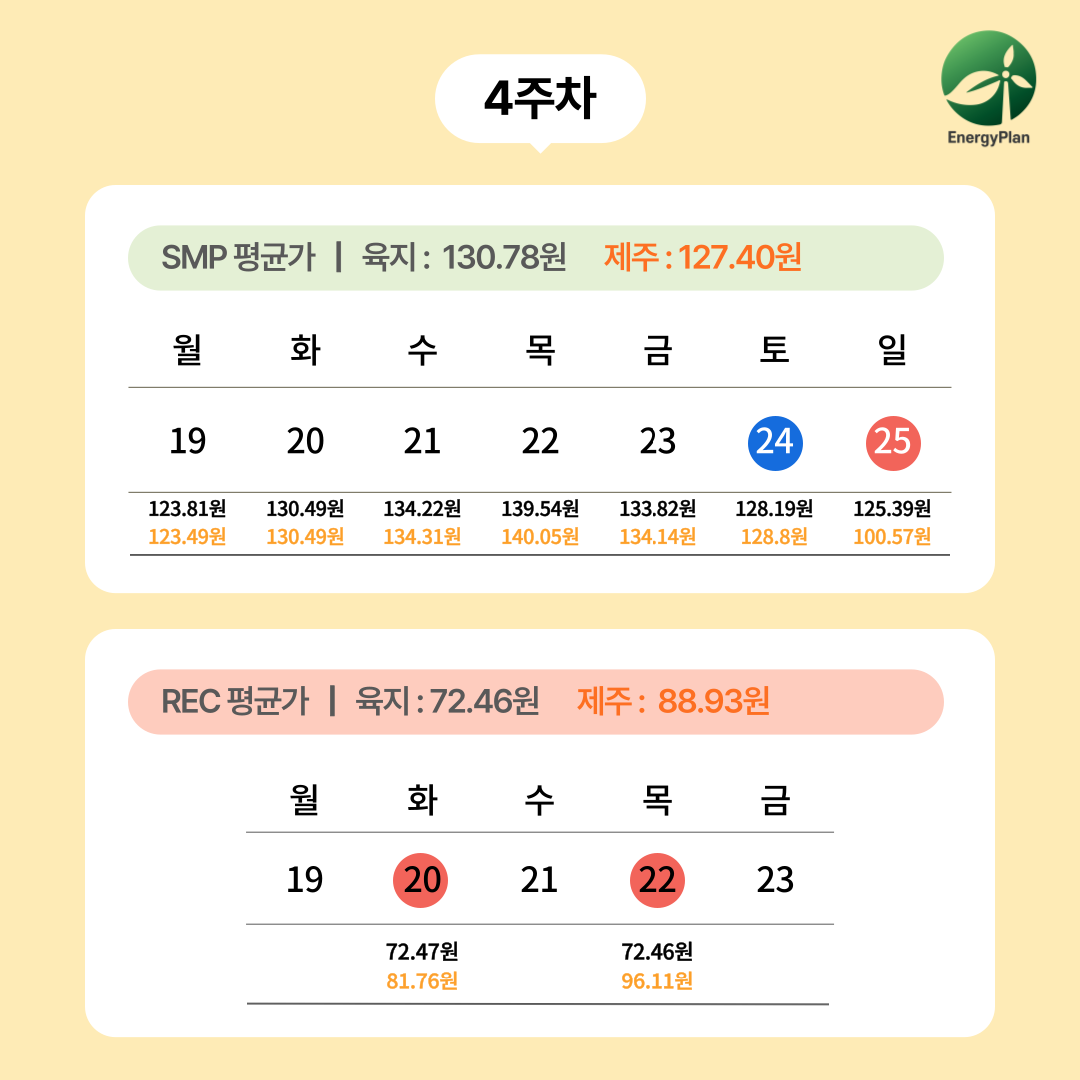 2025년 4주차 SMP(계통한계가격) 및 REC(신재생에너지공급인증서) 평균 단가 정보를 안내드립니다.