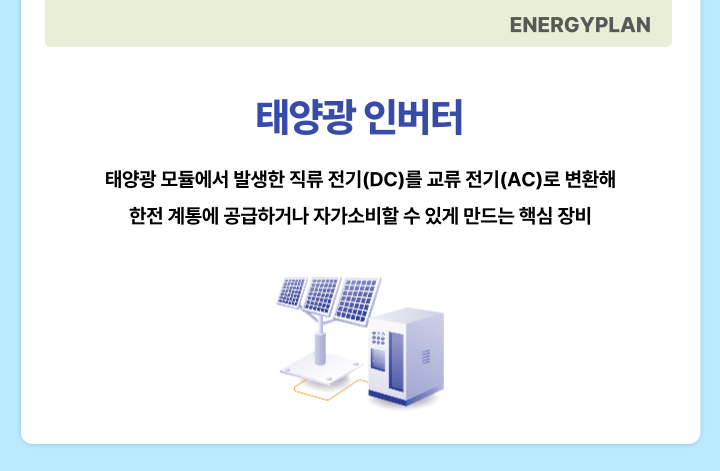 인버터는 태양광 모듈에서 생성된 직류 전기를 ▶ 교류 전기로 변환해 자가소비하거나