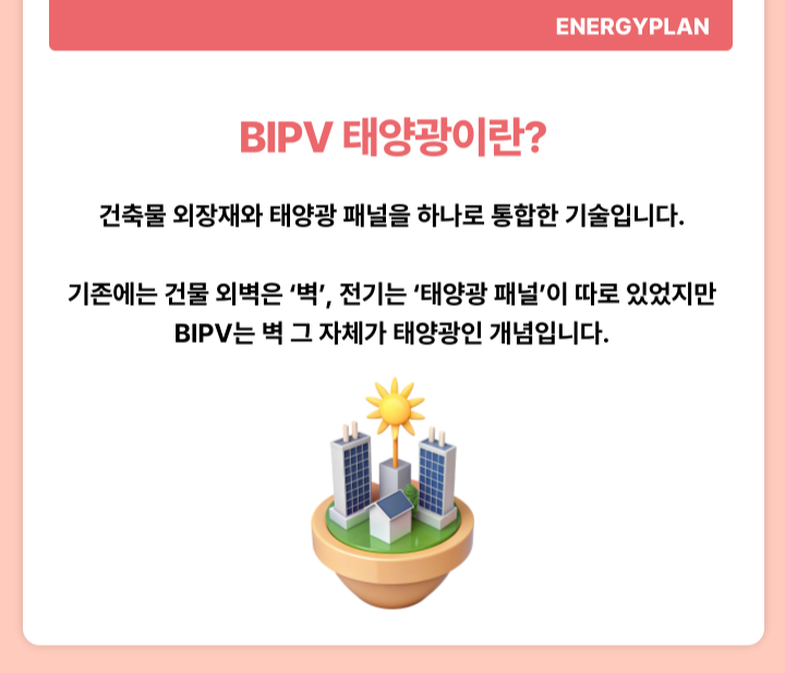 BIPV는 건축물의 일부로 태양광을 통합해 설치함으로써, 디자인과 에너지 효율을 동시에 만족시킬 수 있는 방식입니다.