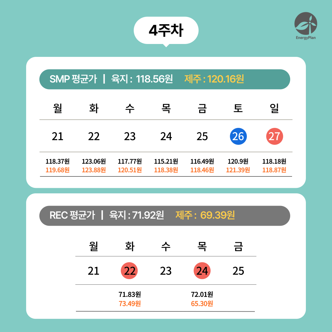 이에 따라, 2025년 7월 4주차 기준 SMP(계통한계가격) 및 REC(신재생에너지공급인증서) 평균 단가 변동 현황을 안내드립니다.