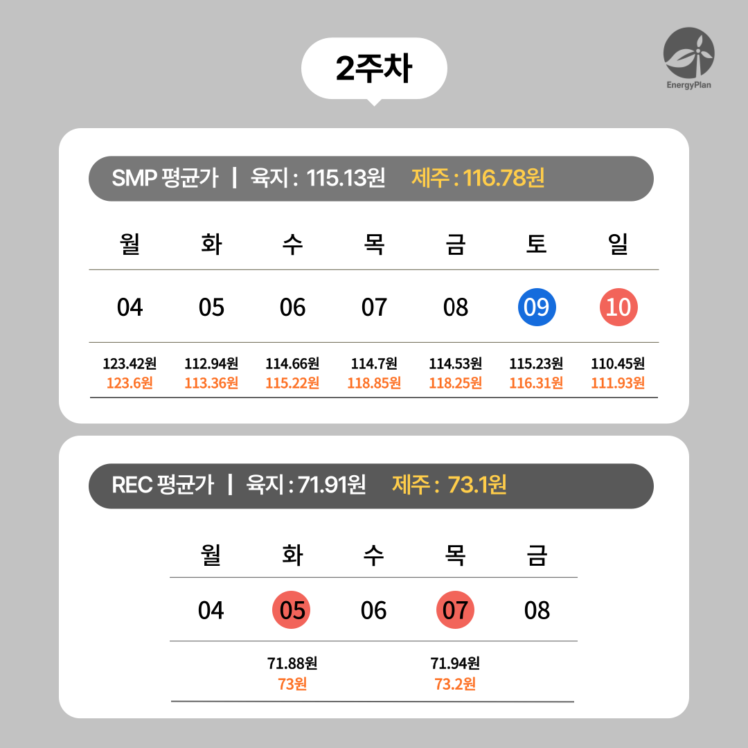 2025년 8월 2주차 SMP(계통한계가격) 및 REC(신재생에너지공급인증서) 현물시장 평균 단가를 안내드립니다.