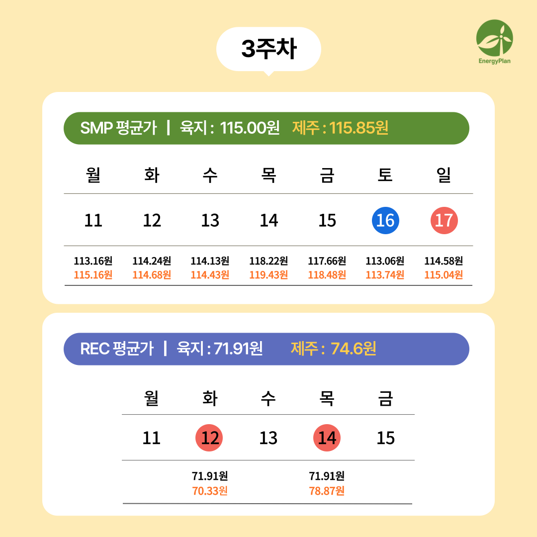 2025년 8월 3주차(25.08.11 ~ 08.17) SMP와 REC 현물시장 가중평균가를 안내드립니다.