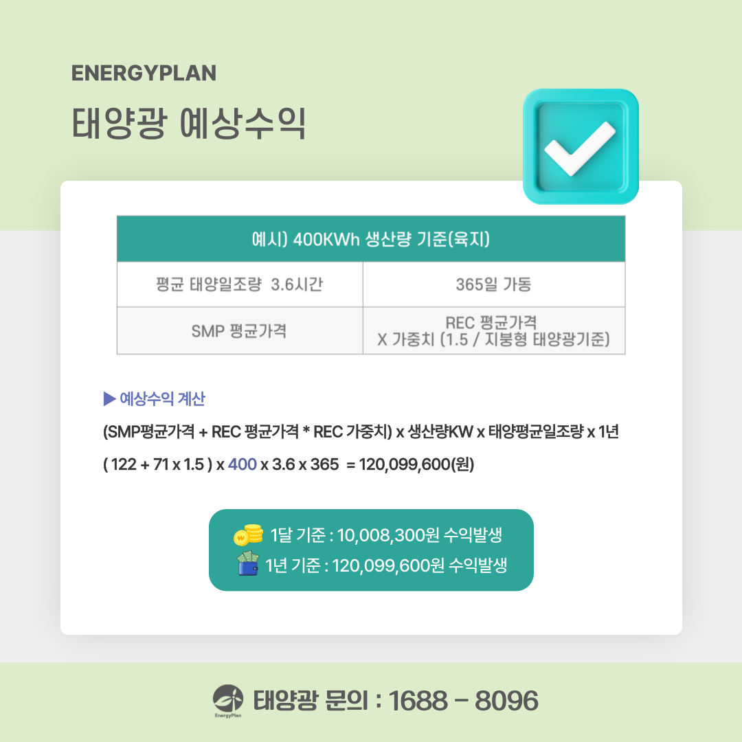 실제 수익은 발전소의 설치 용량, 지역별 일사량, 계절별 발전 효율 등에 따라 변동될 수 있습니다.