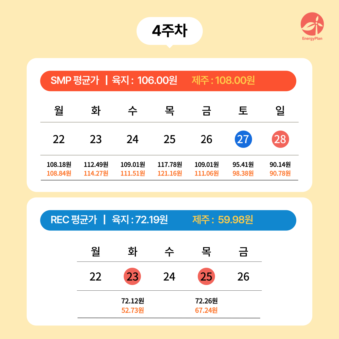2025년 9월 4주차(9월 22일 ~ 9월 28일) 기간의 SMP 및 REC 현물시장 가중평균 단가를 안내드립니다.