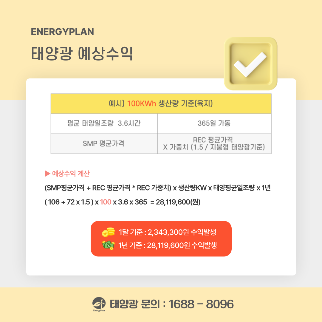 실제 수익은 발전소의 설치 용량, 일사량, 계절별 발전 효율 등에 따라 달라질 수 있습니다.